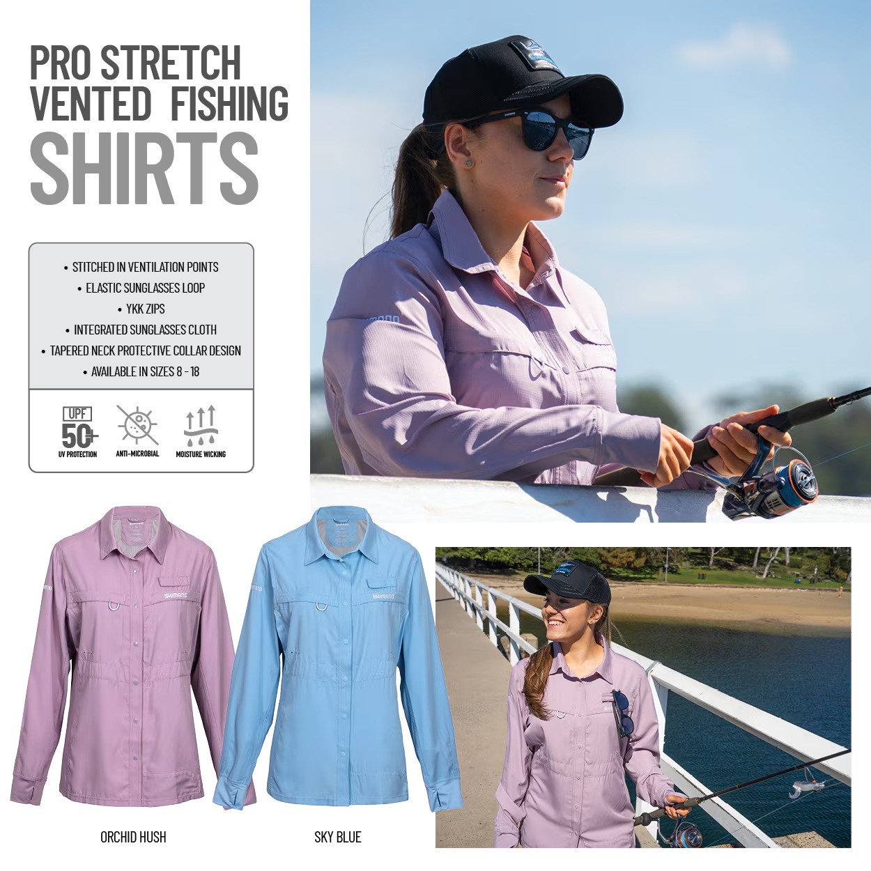 Stay cool, protected, and stylish with the Shimano Ladies Pro Stretch Vented Shirt – a long sleeve, high-performance shirt designed specifically for women who love the outdoors. Featuring UPF 50+ sun protection and a vented design for enhanced breathability, it’s perfect for long days in the sun. Available in sizes 8 to 18 and two elegant colours – Orchid Hush and Sky Blue – this shirt offers a flattering fit and lightweight comfort, making it your ideal shirt for fishing, hiking, or any sun-filled adventure.